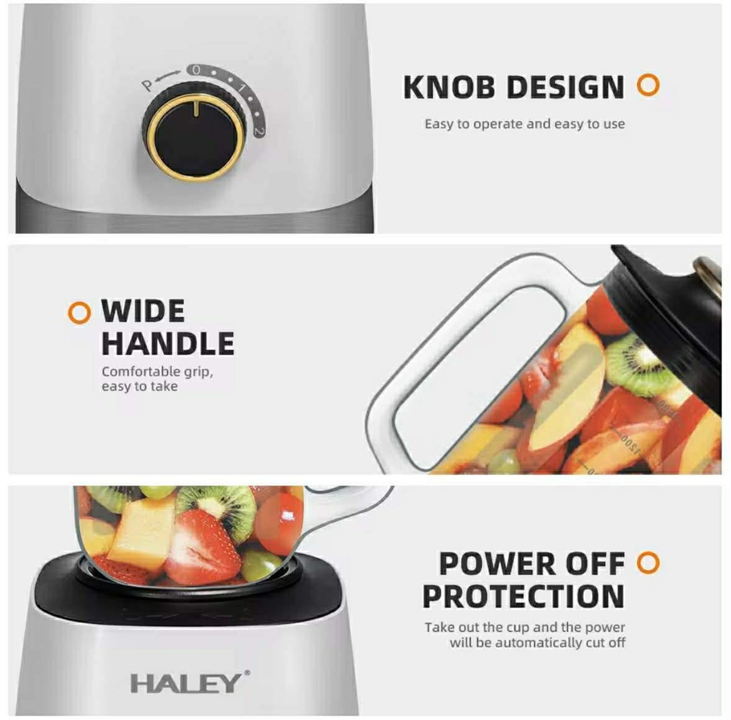 HALEY шүүсний машин нь 1.5L том багтаамжтай сав, 15 шатлалт удирдлагын систем, бат бөх зэвэрдэггүй ган суурьтай. Зэс бүрсэн хөнгөн цагаан мотороор ажилладаг тул гэр бүлийн бүх хэрэгцээг хангах хурдан бөгөөд үр ашигтай шүүс шахдаг.